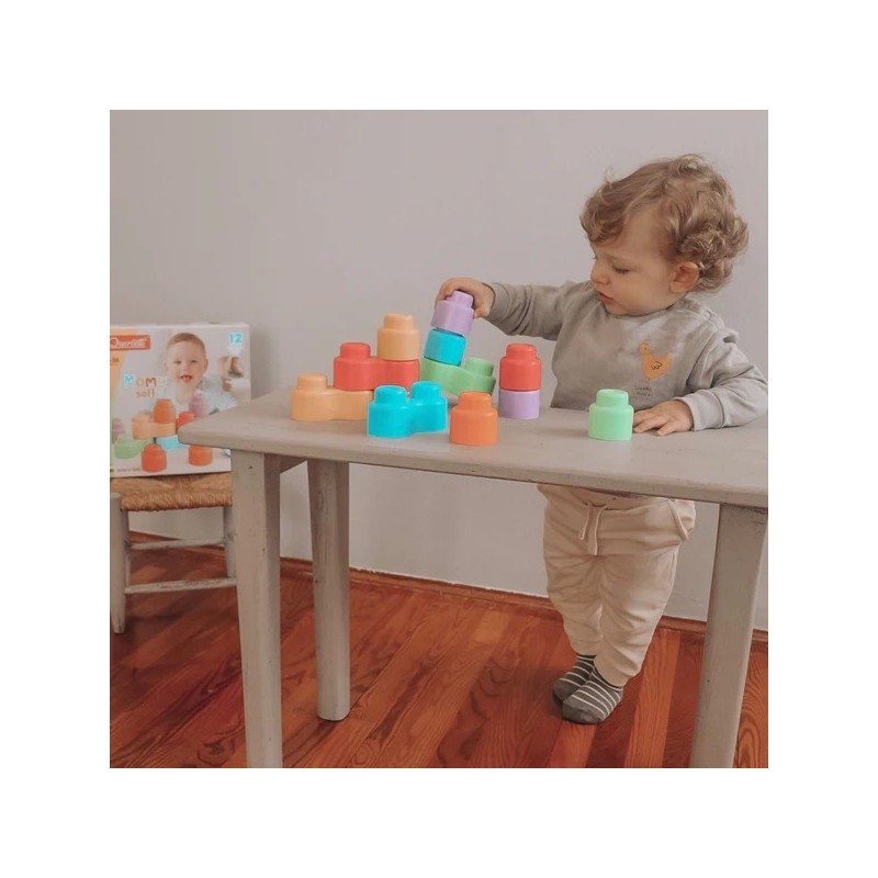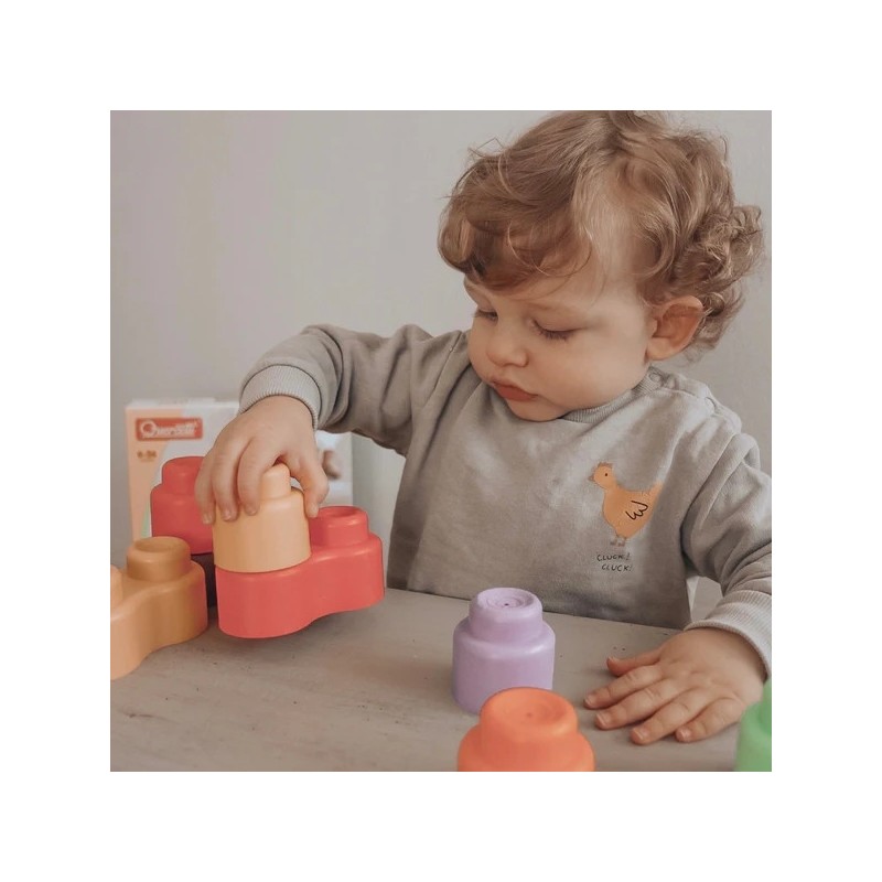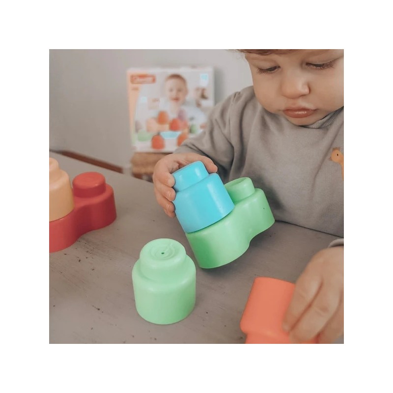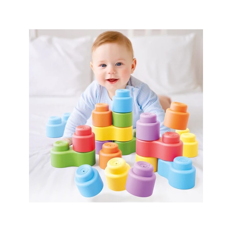 "Contient 24 pièces : 16 monoblocs et 8 blocs double. Matériau souple qui supporte une grande déformation sans se rompre. Permet de s’emboîter facilement et lavable à 30°C (à la main ou au lave-vaisselle). Idéal 6 mois – 3 ans. * TPE (Élastomères Thermoplastiques), également appelé caoutchouc thermoplastique."