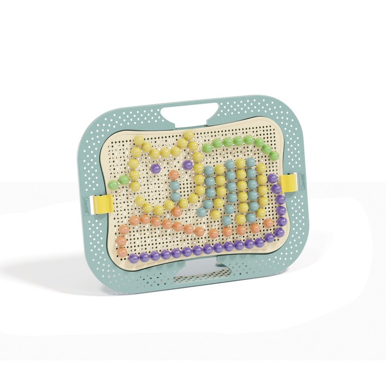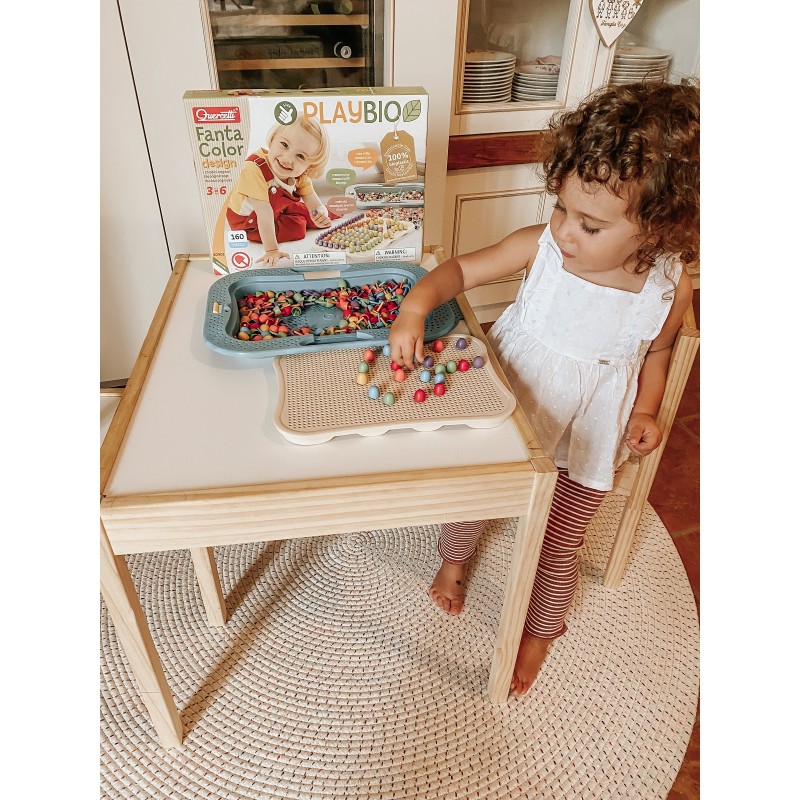 100% bioplastique Contient 160 pièces - Picots de diamètre 15mm de 6 couleurs différents. Livret de modèles fournis. Support facilement transportable grâce à 2 poignées et une fermeture solide pour ranger toutes les pièces après le jeu.