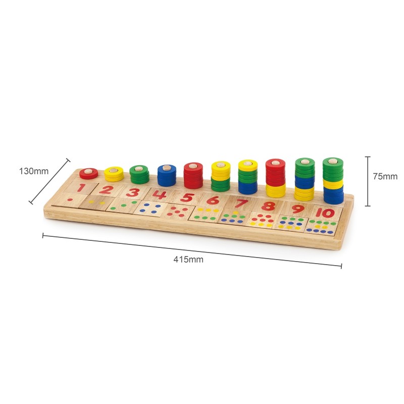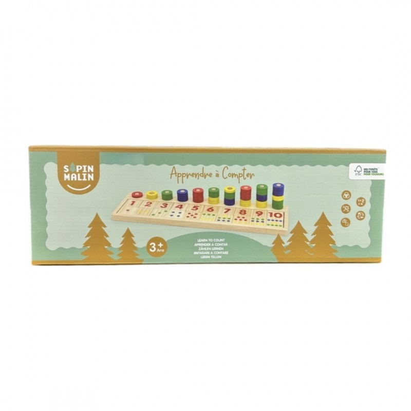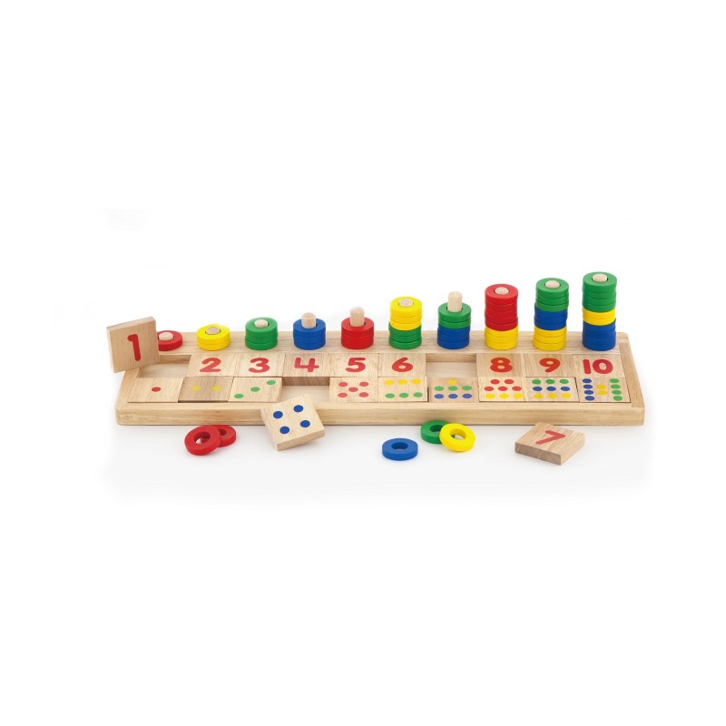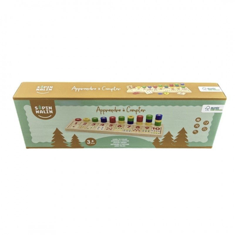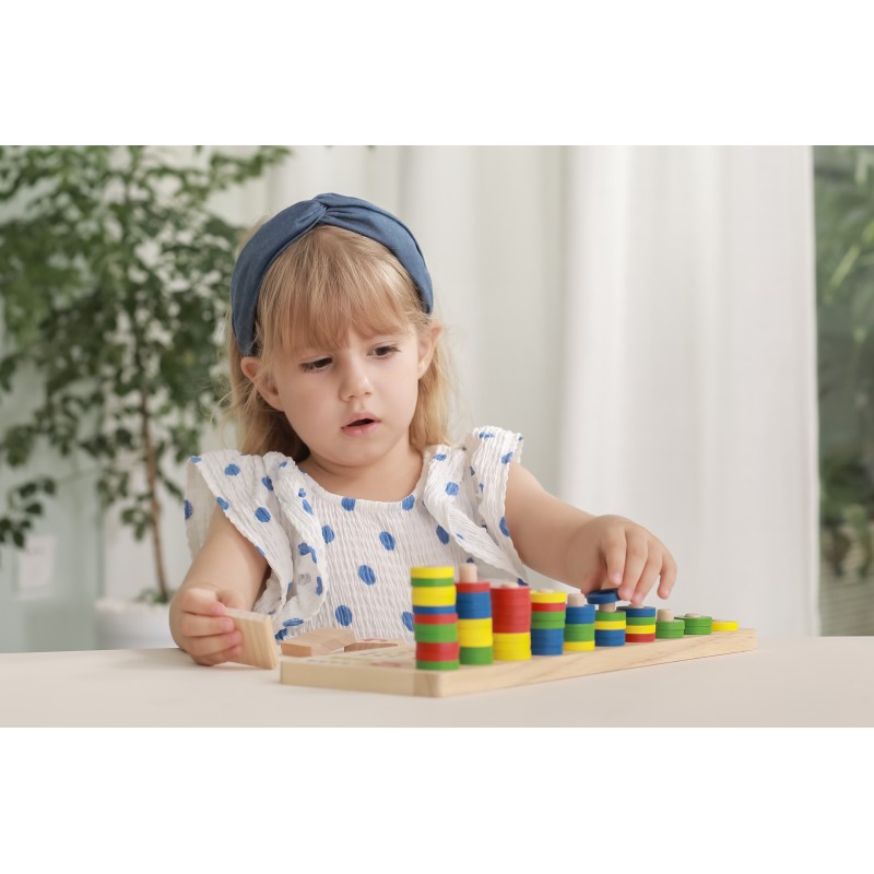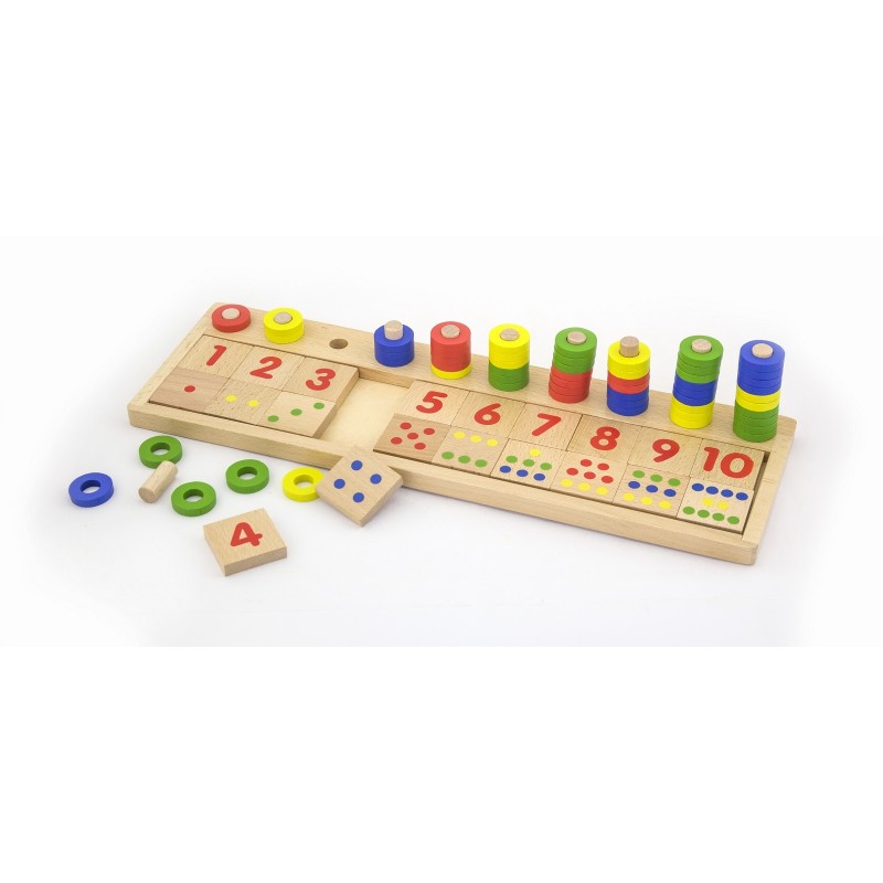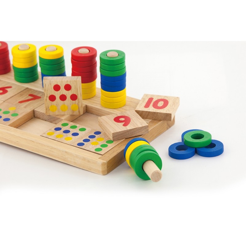 Contient : 9 mâts en bois de différentes tailles, 55 anneaux en bois, 20 morceaux carrés avec des numéros (de 1 à 10) et des points à compter (de 1 à 10) et une base en bois.